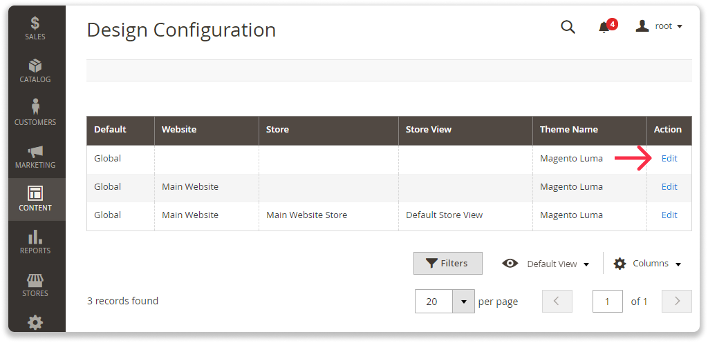 Schritt 3: Wählen Sie die Store-Ansicht aus, die Sie tracken möchten, und wählen Sie "Edit" (bearbeiten) in der "Action"-Säule.
