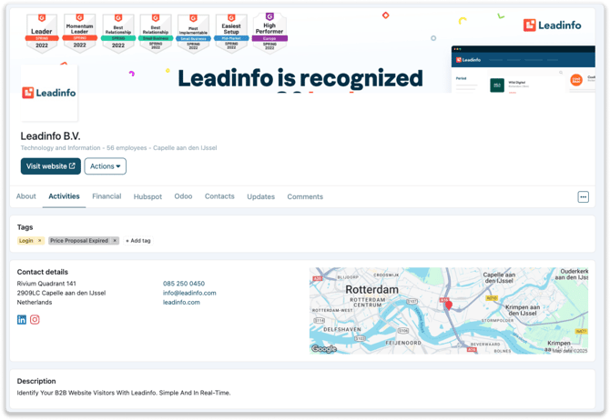 Um alle Informationen zu einem Unternehmen anzuzeigen, klicken Sie einfach auf das Unternehmen in Ihrem Posteingang. In diesem Profil sehen Sie die Unternehmensinformationen und das Verhalten des Besuchers auf der Website. Im Profil finden Sie folgende Informationen: