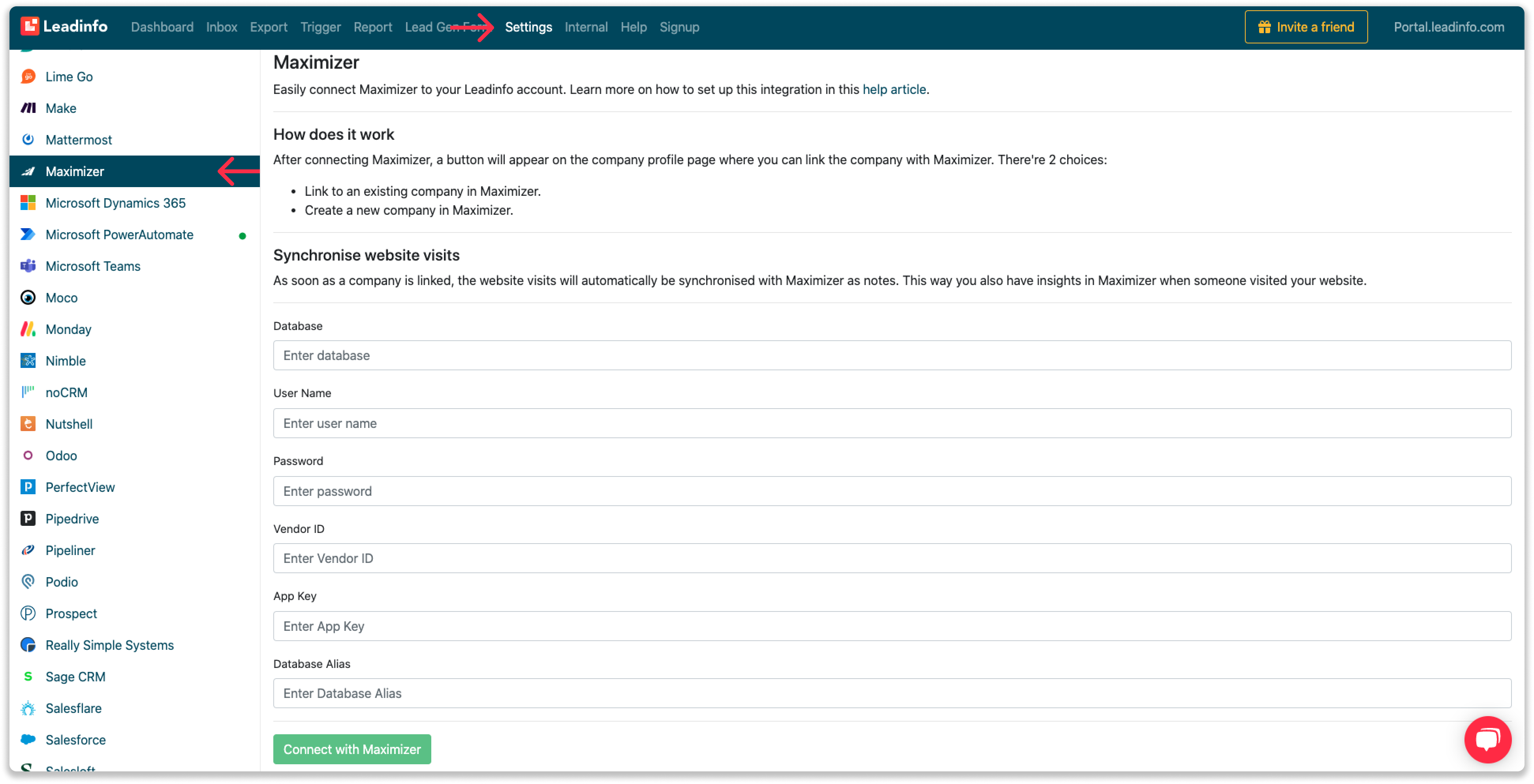 Schritt 5: Sobald Sie Maximizer mit Leadinfo verknüpft haben, können Sie die Einstellungen der Integration ändern.