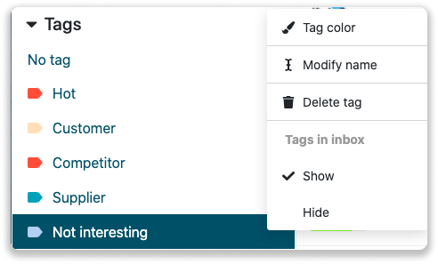 Standardmäßig haben wir bereits einige Tags in Ihrem Posteingang erstellt. Eines dieser Tags ist das Tag "Verdeckt". Wenn Sie dieses Tag einem Unternehmen zuweisen, wird das Unternehmen für alle Benutzer in Ihrem Konto ausgeblendet.