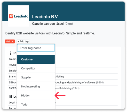 Gut zu wissen: Es ist nur möglich, Firmen in Ihrer Inbox mithilfe von Tags zu verbergen. Es ist nicht möglich, Firmen komplett aus dem System zu entfernen, oder sie vom Traffic auszuschließen - sie werden immer zu Ihrem gesamten Traffic dazugezählt. Leadinfo berücksichtigt jedoch in jedem Paket immer eine Fair-Use-Marge von 5 %, um möglicherweise irrelevante Besuche abzudecken, sodass Ihnen diese niemals in Rechnung gestellt werden.