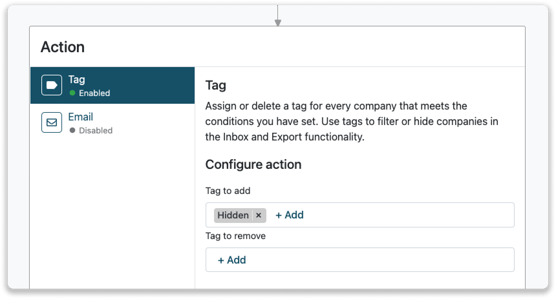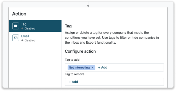 Klicken Sie in der Inbox auf die entsprechende Firma. Im Firmenprofil können Sie auf "+ Tag hinzufügen" klicken, und dann den Tag "Nicht Interessant" suchen. Sobald Sie das Tag der Firma zugewiesen haben, wird diese in Ihrer Inbox verborgen.