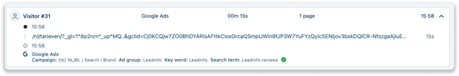 With the Google Ads integration, you can measure the effectiveness of your advertising campaigns. When a company visits your website via a Google Ads Advert, you will see via what campaign, ad group or search term he/she visited the website.