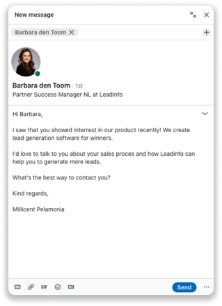 Maakt jouw bedrijf gebruikt van Sales Navigator? Dan kun je de informatie uit Leadinfo ook inzetten voor Sales Navigator. Via InMail kun je een berichtje sturen naar een contactpersoon van dat bedrijf. Daarbij kun je ook via Sales Navigator op zoek gaan naar de juiste contactpersoon die jij wilt spreken. Sales Navigator is de manier om laagdrempelig contact te leggen met interessante website bezoekers. Onderstaand een voorbeeld die je kan gebruiken!